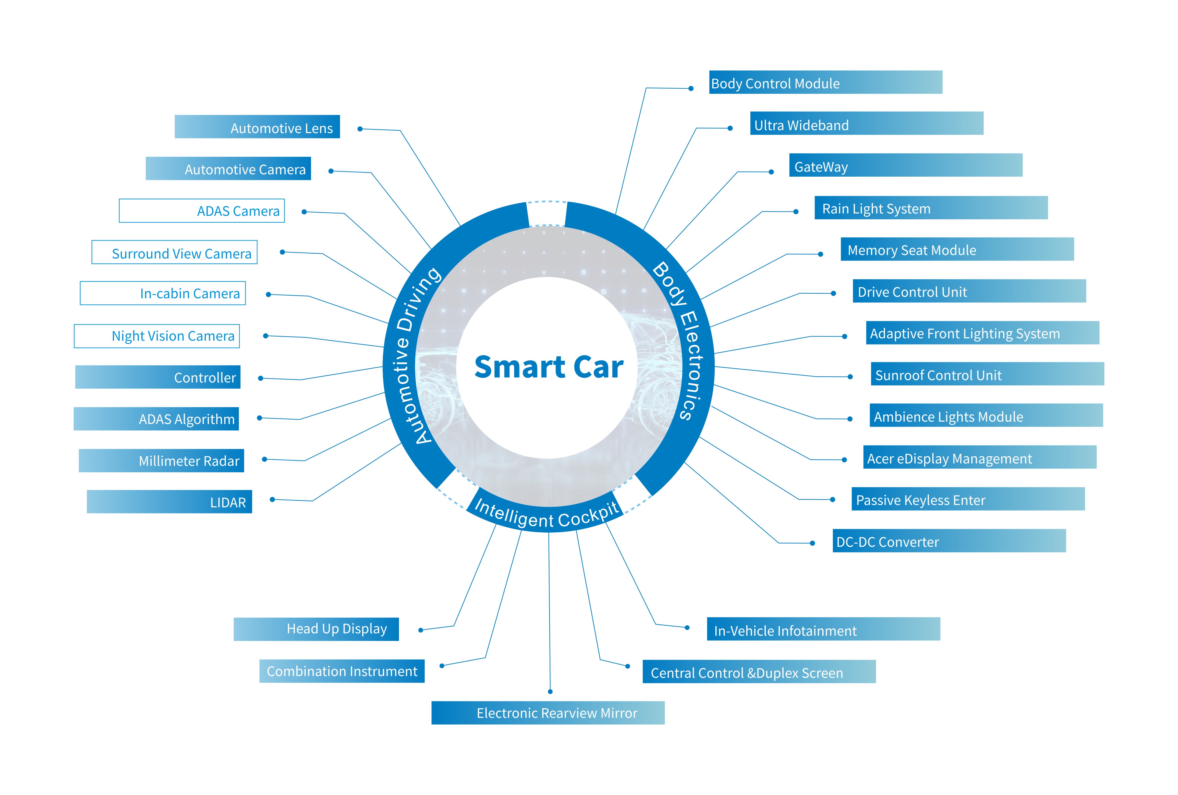 OFilm has started smart cars business since 2015 and has accumulated experience in both hardware and software. We can provide customers with cost-effective BCM/BGM, GW, RLS, seat memory modules and other products.