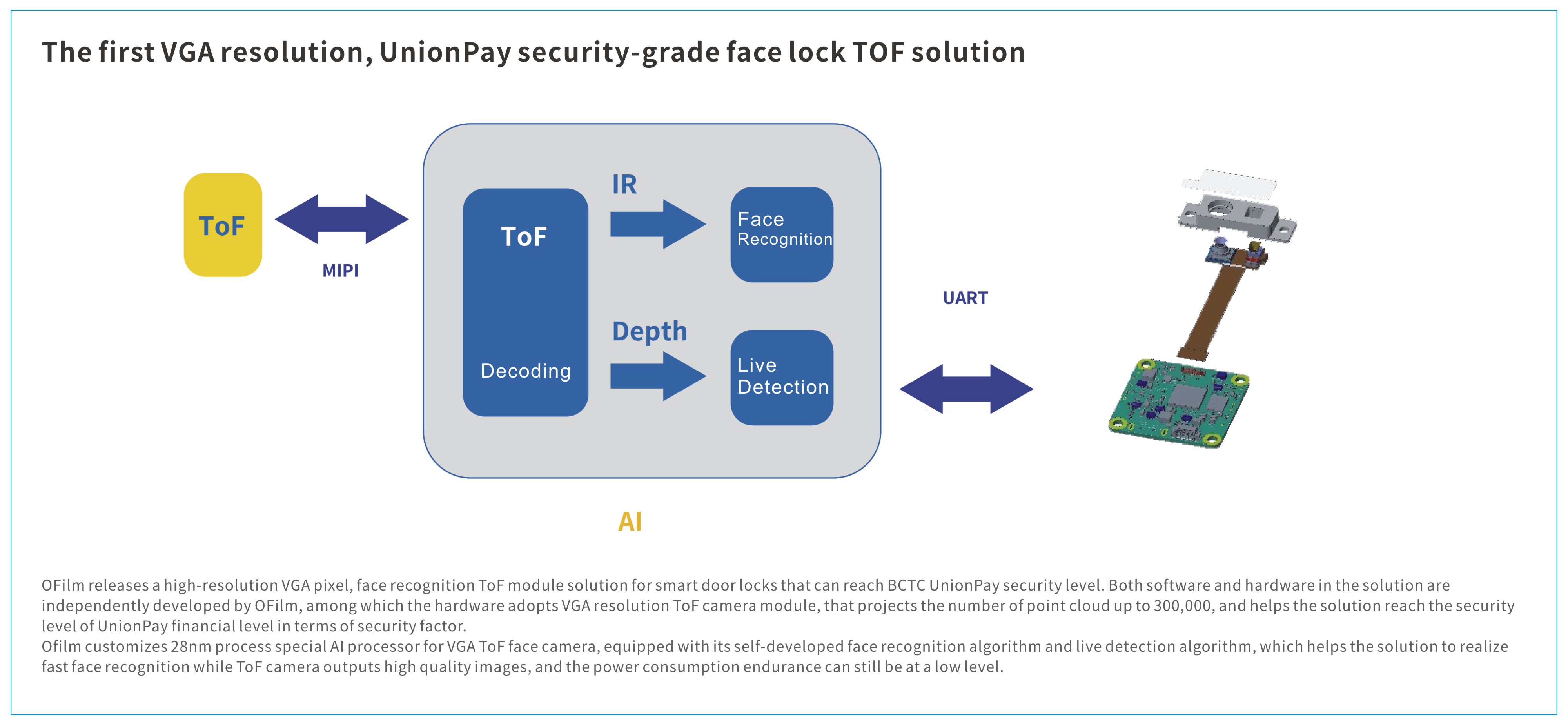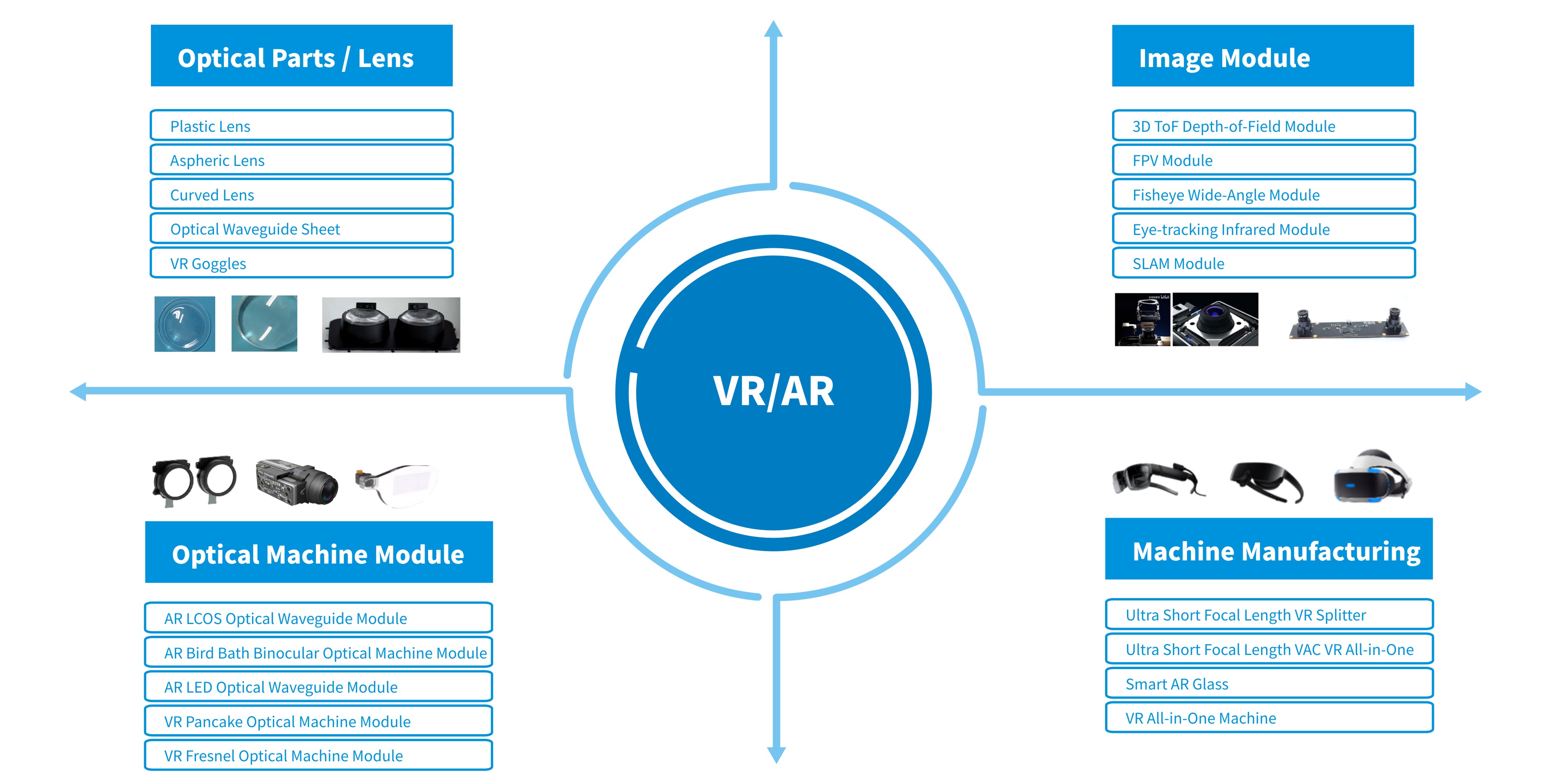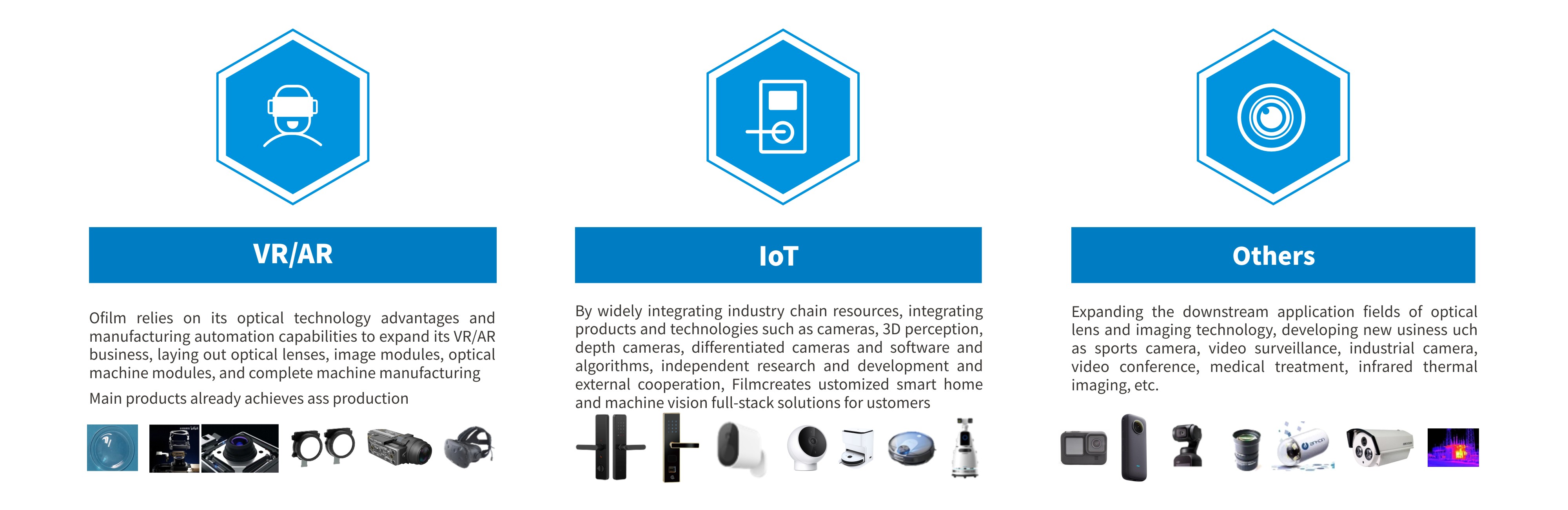 OFilm continues to strengthen the research and development of new business products, with a wide layout of IoT field, including intelligent door locks, IPC and robots, also of VR/AR field, including optical lenses, image modules, optical machine modules and complete assembly, as well as other new fields such as sports cameras, medical endoscopes, industrial cameras and other optical new business.